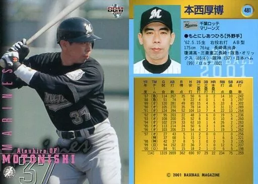 Nombre comercial en japonés: BBM/レギュラーカード/BBM2001ベースボールカード 481:本西厚博「千葉ロッテマリーンズ」