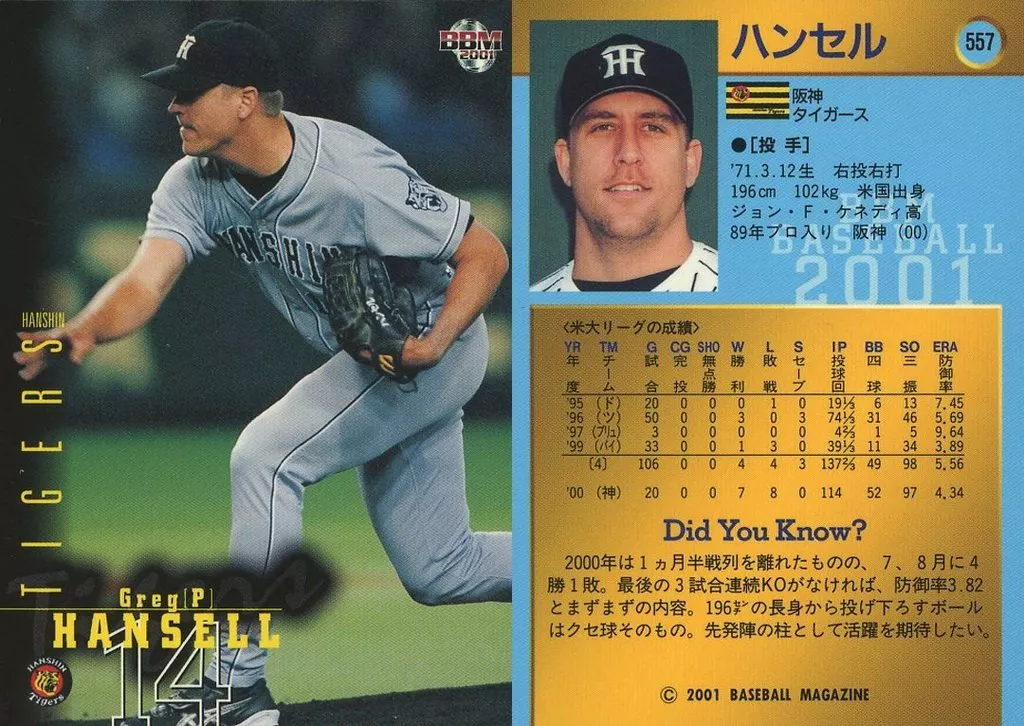 Nombre comercial en japonés: BBM/レギュラーカード/BBM2001ベースボールカード 557:ハンセル「阪神タイガース」