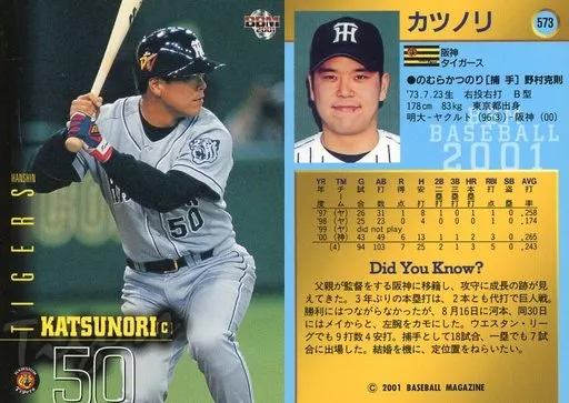 Nombre comercial en japonés: BBM/レギュラーカード/BBM2001ベースボールカード 573:カツノリ「阪神タイガース」