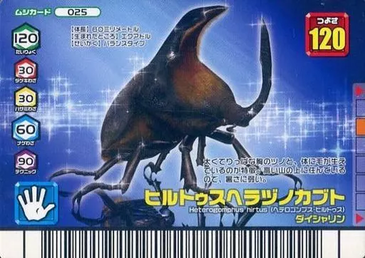Nombre comercial en japonés: ムシキング/ムシカード/2007 ダイヤモンドブルー 025:ヒルトゥスヘラヅノカブト