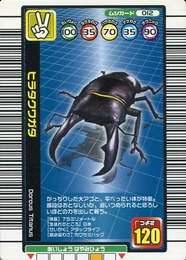 Nombre comercial en japonés: ムシキング/ムシカード/1億枚突破記念限定デザイン 012:ヒラタクワガタ