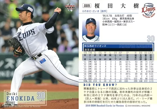 Nombre comercial en japonés: BBM/レギュラーカード/埼玉西武ライオンズ/BBM2019 ベースボールカード 1stバージョン 009 [レギュラーカード] : 榎田大樹