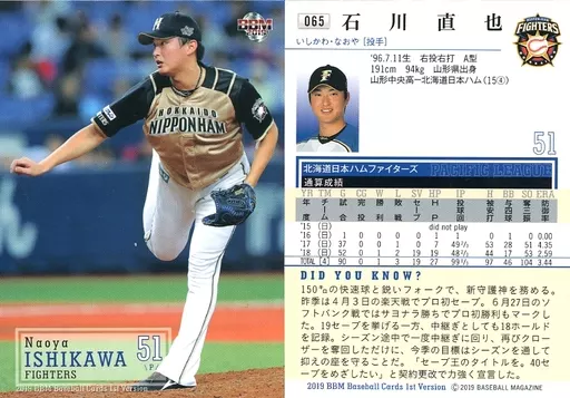 Nombre comercial en japonés: BBM/レギュラーカード/北海道日本ハムファイターズ/BBM2019 ベースボールカード 1stバージョン 065 [レギュラーカード] : 石川直也