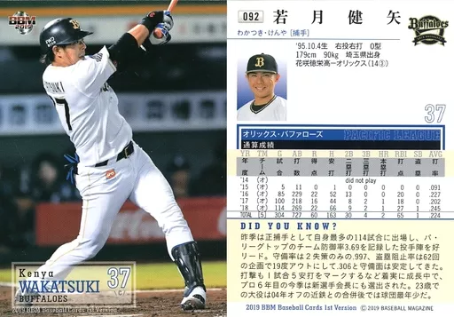 Nombre comercial en japonés: BBM/レギュラーカード/オリックス・バファローズ/BBM2019 ベースボールカード 1stバージョン 092 [レギュラーカード] : 若月健矢
