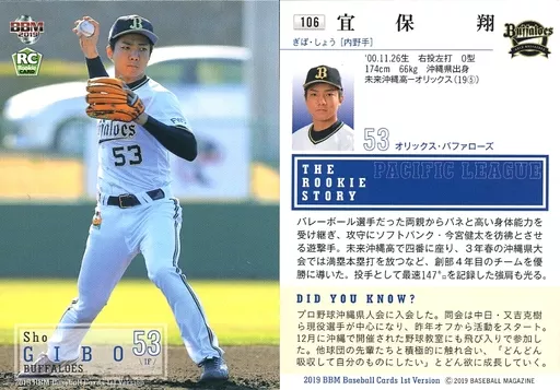 Nombre comercial en japonés: BBM/レギュラーカード/オリックス・バファローズ/BBM2019 ベースボールカード 1stバージョン 106 [レギュラーカード] : 宜保翔