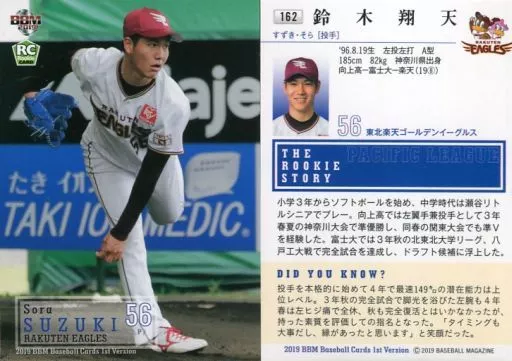 Nombre comercial en japonés: BBM/レギュラーカード/東北楽天ゴールデンイーグルス/BBM2019 ベースボールカード 1stバージョン 162 [レギュラーカード] : 鈴木翔天