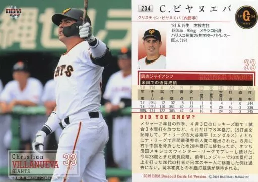 Nombre comercial en japonés: BBM/レギュラーカード/読売ジャイアンツ/BBM2019 ベースボールカード 1stバージョン 234 [レギュラーカード] : C.ビヤヌエバ