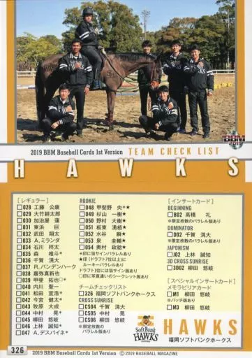 Nombre comercial en japonés: BBM/レギュラーカード/チームチェックリスト/BBM2019 ベースボールカード 1stバージョン 326 [レギュラーカード] : 福岡ソフトバンクホークス