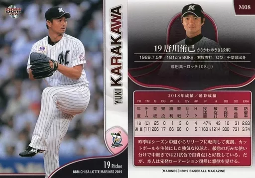Nombre comercial en japonés: BBM/レギュラーカード/千葉ロッテマリーンズ/BBM2019 千葉ロッテマリーンズ M08 [レギュラーカード] : 唐川侑己
