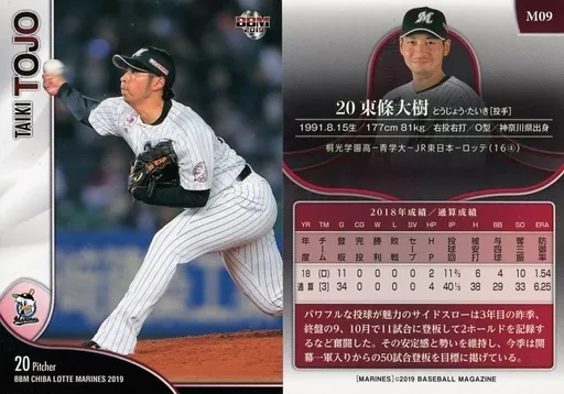 Nombre comercial en japonés: BBM/レギュラーカード/千葉ロッテマリーンズ/BBM2019 千葉ロッテマリーンズ M09 [レギュラーカード] : 東條大樹