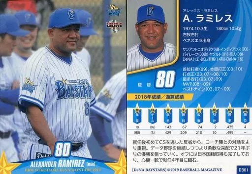 Nombre comercial en japonés: BBM/レギュラーカード/横浜DeNAベイスターズ/BBM2019 横浜DeNAベイスターズ DB01 [レギュラーカード] : A.ラミレス