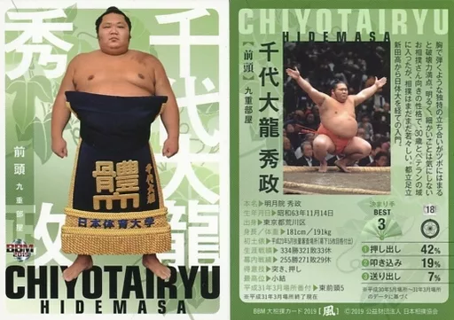 Nombre comercial en japonés: BBM/レギュラーカード/BBM2019 大相撲カード「風」 18 [レギュラーカード] : 千代大龍 秀政