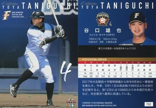 Nombre comercial en japonés: BBM/レギュラーカード/BBM2019 北海道日本ハムファイターズ F60 [レギュラーカード] : 谷口雄也