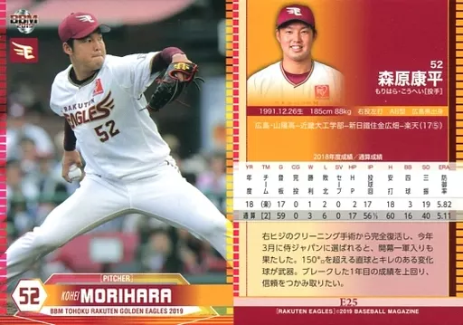 Nombre comercial en japonés: BBM/レギュラーカード/BBM2019 東北楽天ゴールデンイーグルス E25 [レギュラーカード] : 森原康平