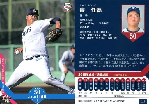 Nombre comercial en japonés: BBM/レギュラーカード/BBM2019 埼玉西武ライオンズ L29 [レギュラーカード] : 廖任磊