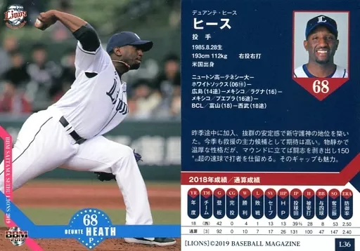 Nombre comercial en japonés: BBM/レギュラーカード/BBM2019 埼玉西武ライオンズ L36 [レギュラーカード] : ヒース