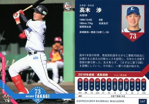 Nombre comercial en japonés: BBM/レギュラーカード/BBM2019 埼玉西武ライオンズ L67 [レギュラーカード] : 高木渉