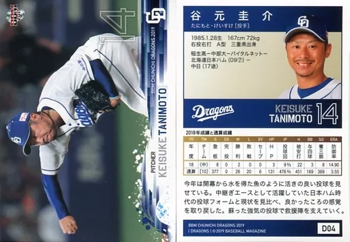 Nombre comercial en japonés: BBM/レギュラーカード/BBM2019 中日ドラゴンズ D04 [レギュラーカード] : 谷元圭介