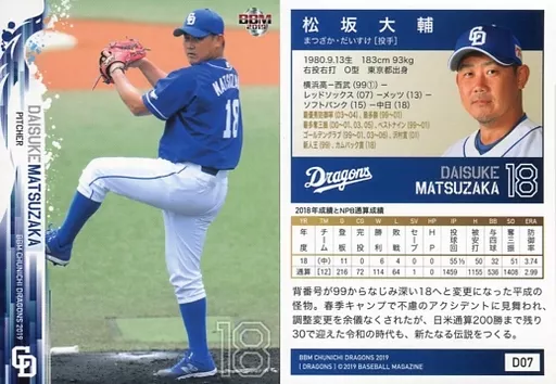 Nombre comercial en japonés: BBM/レギュラーカード/BBM2019 中日ドラゴンズ D07 [レギュラーカード] : 松坂大輔