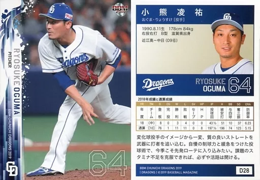 Nombre comercial en japonés: BBM/レギュラーカード/BBM2019 中日ドラゴンズ D28 [レギュラーカード] : 小熊凌祐