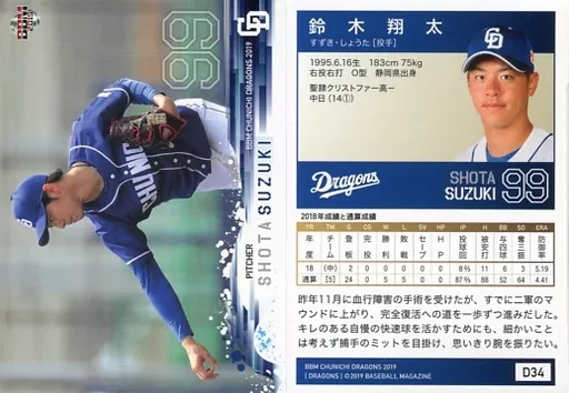 Nombre comercial en japonés: BBM/レギュラーカード/BBM2019 中日ドラゴンズ D34 [レギュラーカード] : 鈴木翔太