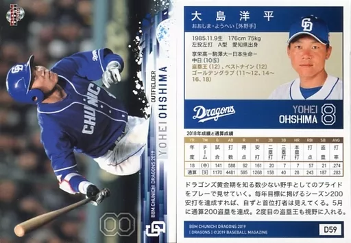 Nombre comercial en japonés: BBM/レギュラーカード/BBM2019 中日ドラゴンズ D59 [レギュラーカード] : 大島洋平
