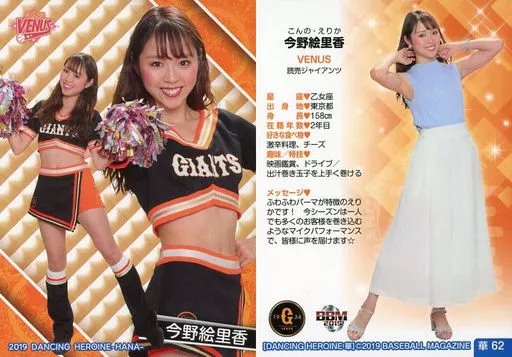 Nombre comercial en japonés: BBM/レギュラーカード/VENUS/BBM2019 プロ野球チアリーダーカード DANCING HEROINE -華- 華62 [レギュラーカード] : 今野絵里香