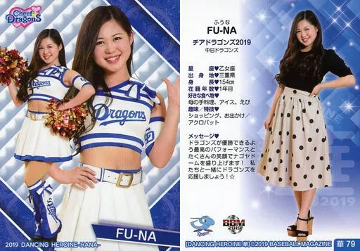 Nombre comercial en japonés: BBM/レギュラーカード/チアドラゴンズ2019/BBM2019 プロ野球チアリーダーカード DANCING HEROINE -華- 華79 [レギュラーカード] : FU-NA