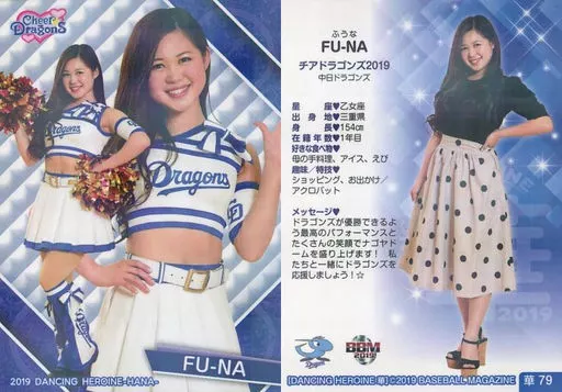 Nombre comercial en japonés: BBM/レギュラーカード/チアドラゴンズ2019/BBM2019 プロ野球チアリーダーカード DANCING HEROINE -華- 華79 [レギュラーカード] : FU-NA(パラレル版)