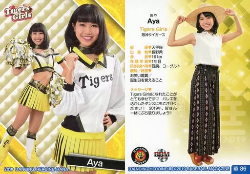 Nombre comercial en japonés: BBM/レギュラーカード/Tigers Girls/BBM2019 プロ野球チアリーダーカード DANCING HEROINE -華- 華86 [レギュラーカード] : Aya
