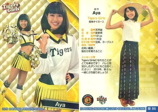 Nombre comercial en japonés: BBM/レギュラーカード/Tigers Girls/BBM2019 プロ野球チアリーダーカード DANCING HEROINE -華- 華86 [レギュラーカード] : Aya(パラレル版)