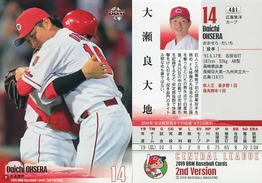 Nombre comercial en japonés: BBM/レギュラーカード/広島東洋カープ/BBM2019 ベースボールカード 2ndバージョン 481 [レギュラーカード] : 大瀬良大地