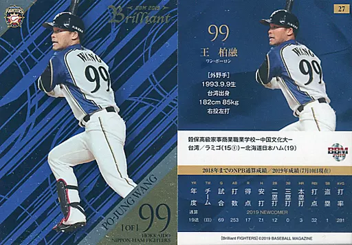 Nombre comercial en japonés: BBM/レギュラーカード/北海道日本ハムファイターズ/BBM2019 Brilliant 北海道日本ハムファイターズ 27 [レギュラーカード] : 王柏融
