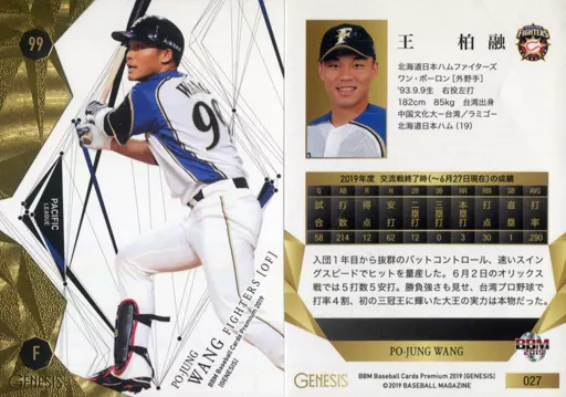 Nombre comercial en japonés: BBM/レギュラーカード/北海道日本ハムファイターズ/BBM2019 ジェネシス 027 [レギュラーカード] : 王柏融