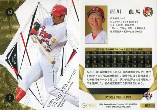 Nombre comercial en japonés: BBM/レギュラーカード/広島東洋カープ/BBM2019 ジェネシス 059 [レギュラーカード] : 西川龍馬