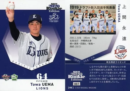 Nombre comercial en japonés: BBM/レギュラーカード/埼玉西武ライオンズ/BBM2020 ルーキーエディション 007[レギュラーカード]:上間永遠