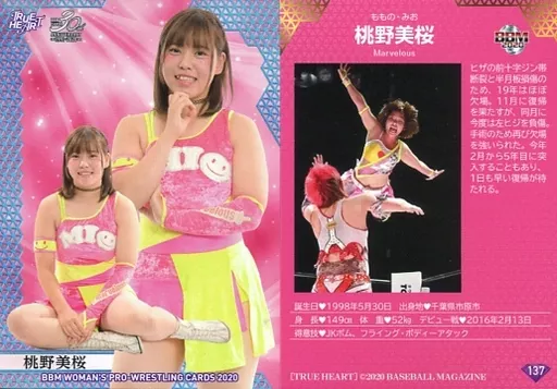Nombre comercial en japonés: BBM/レギュラーカード/現役選手/-/BBM 女子プロレスカード2020 TRUE HEART 137 [レギュラーカード] : 桃野美桜