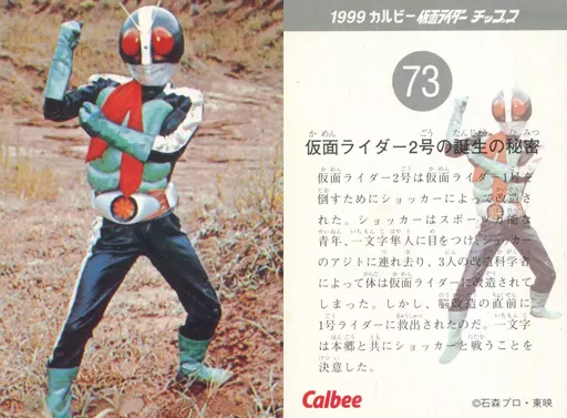 Nombre comercial en japonés: アニメ系トレカ/1999 カルビー 仮面ライダー チップス 第2弾 73:仮面ライダー2号誕生の秘密