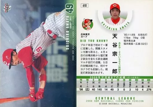 Nombre comercial en japonés: BBM/インサートカード/レギュラーパラレルカード/広島東洋カープ/BBM2008 ベースボールカード2ndバージョン[ライトパック] 610 [インサートカード] : 天谷宗一郎(キラ)