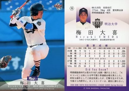 Nombre comercial en japonés: BBM/レギュラーカード/明治大学/BBM 2008春 東京六大学野球カードセット 15 [レギュラーカード] : 梅田大喜