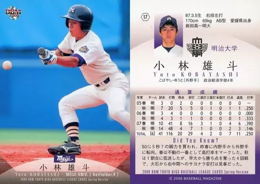Nombre comercial en japonés: BBM/レギュラーカード/明治大学/BBM 2008春 東京六大学野球カードセット 17 [レギュラーカード] : 小林雄斗