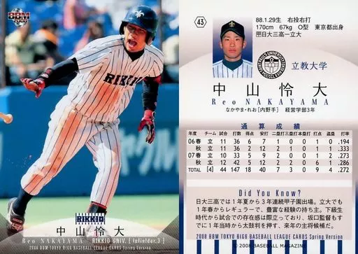 Nombre comercial en japonés: BBM/レギュラーカード/立教大学/BBM 2008春 東京六大学野球カードセット 43 [レギュラーカード] : 中山怜大
