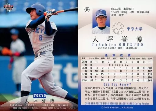 Nombre comercial en japonés: BBM/レギュラーカード/東京大学/BBM 2008春 東京六大学野球カードセット 49 [レギュラーカード] : 大坪誉博