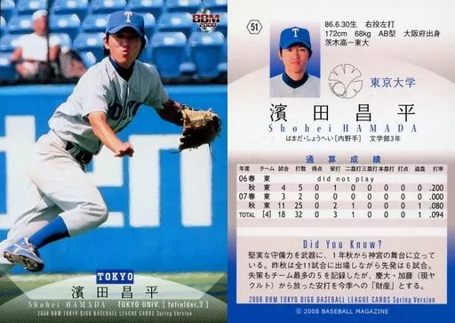 Nombre comercial en japonés: BBM/レギュラーカード/東京大学/BBM 2008春 東京六大学野球カードセット 51 [レギュラーカード] : 濱田昌平