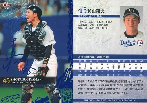 Nombre comercial en japonés: BBM/レギュラーカード/BBM2016 中日ドラゴンズ Autographed Edition DRAGONS DASH 16[レギュラーカード]:杉山翔大(青箔押しサイン入り)