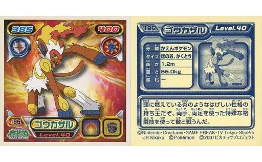 Nombre comercial en japonés: コレクションシール/ノーマル/ポケットモンスターダイヤモンド&パール最強シール烈伝3 196[ノーマル]:ゴウカザル