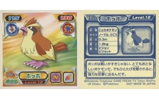 Nombre comercial en japonés: コレクションシール/ノーマル/ポケットモンスターダイヤモンド&パール最強シール烈伝4 335[ノーマル]:ポッポ