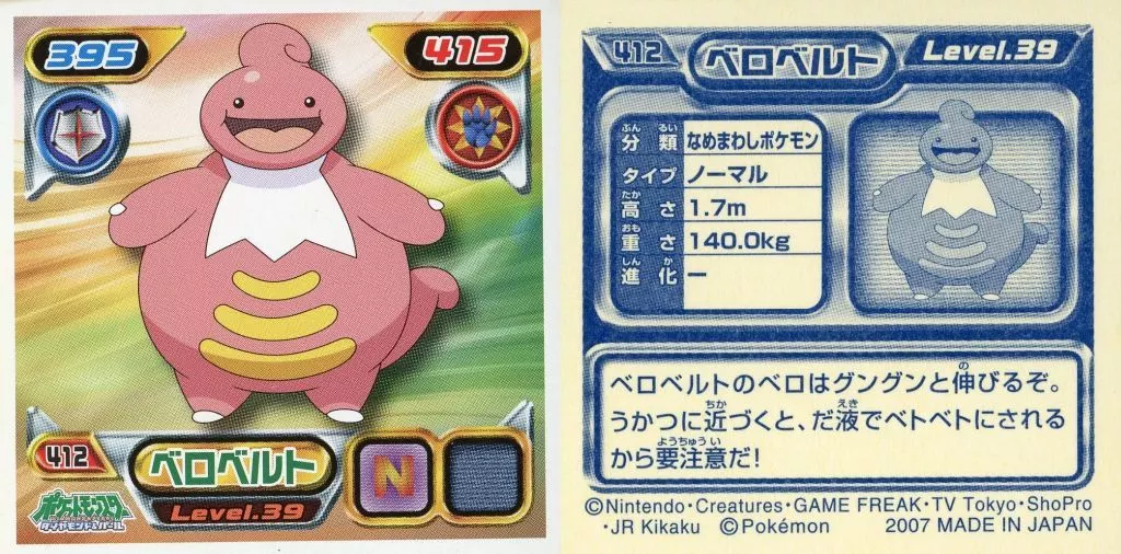 Nombre comercial en japonés: コレクションシール/ノーマル/ポケットモンスターダイヤモンド&パール最強シール烈伝5 412[ノーマル]:ベロベルト