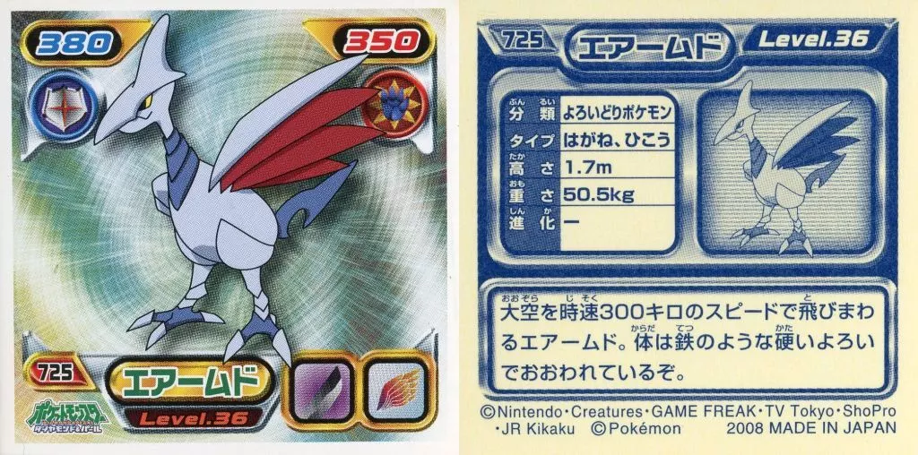 Nombre comercial en japonés: コレクションシール/ノーマル/ポケットモンスターダイヤモンド&パール最強シール烈伝8 725[ノーマル]:エアームド