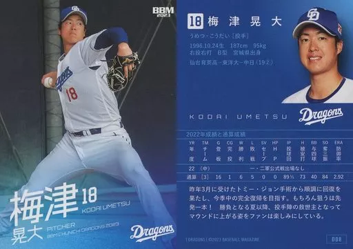 Nombre comercial en japonés: BBM/レギュラーカード/BBM2023 中日ドラゴンズ D08[レギュラーカード]:梅津晃大